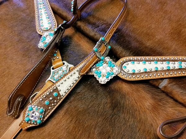 Bejeweled Turquoise And White Headstall And Breastplate